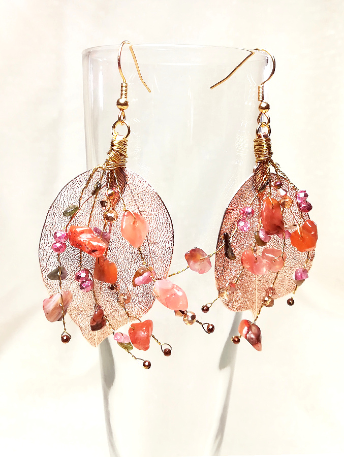Real leaf earrings | rose gold with Rose Quartz