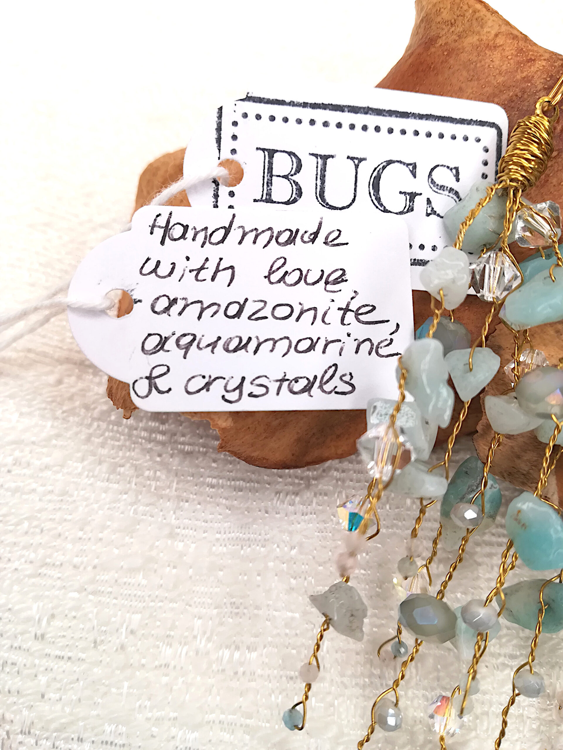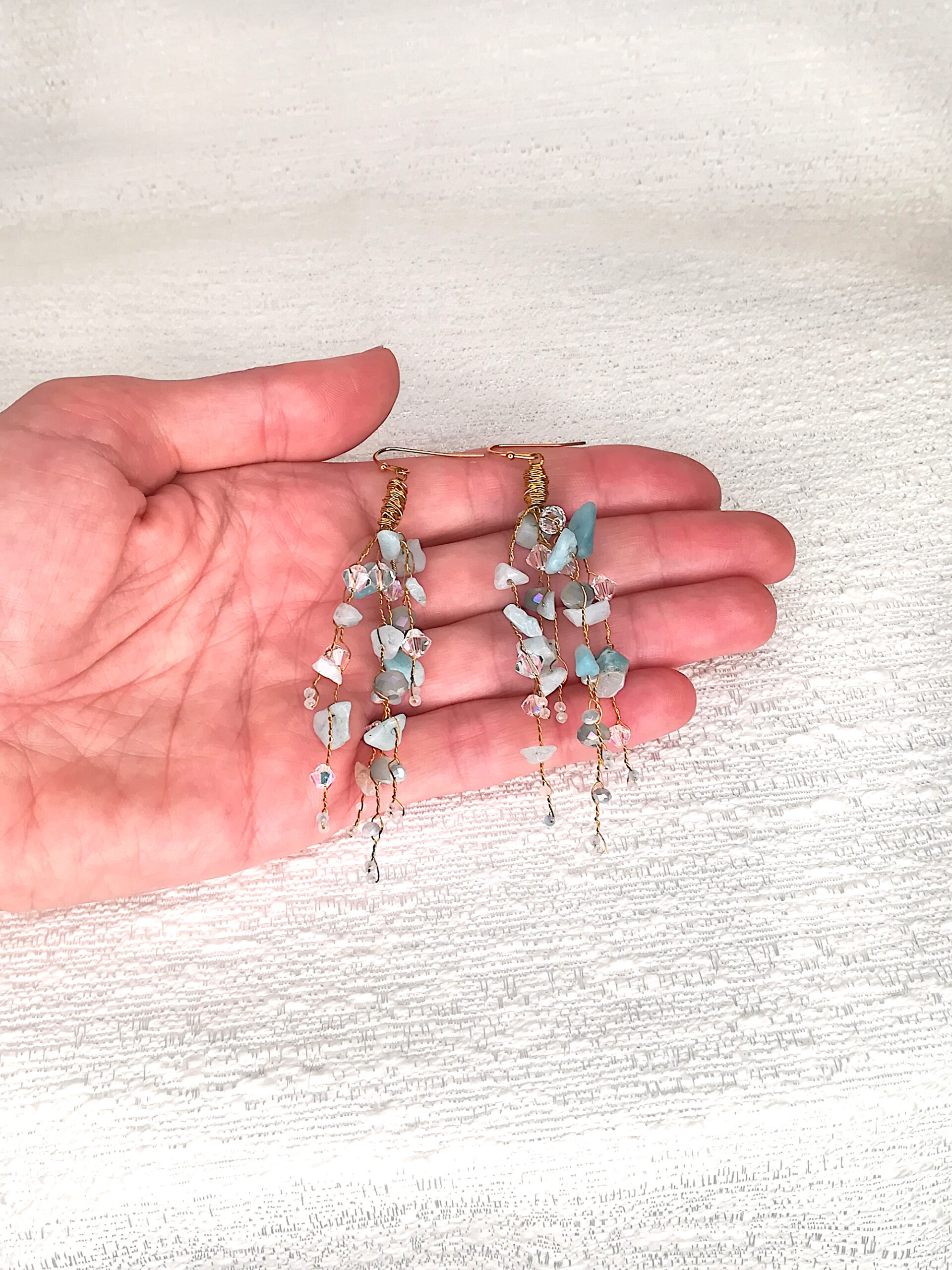 Handmade earrings featuring an assortment of branches with semi precious stones. Amazonite chips as well as aquamarine & crystal beads are part of their composition. Their ear-wire is 24k gold filled stainless steel and is safe for allergies. The wire on the branches is copper painted in gold colour.